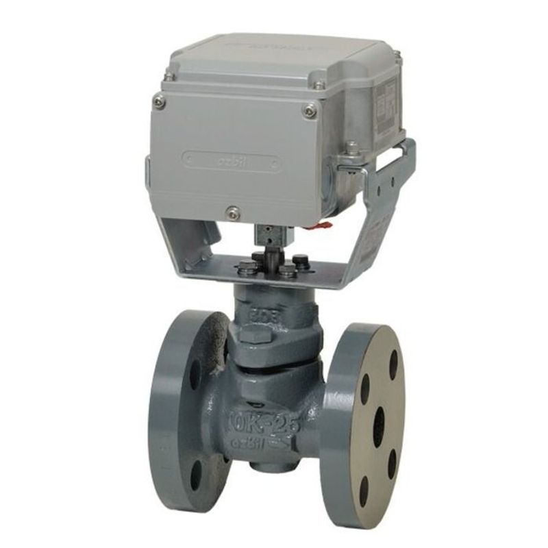 Motorized 2-way rotary valves with flanged-end connection, valve and actuator are integrated in a single unit. Nominal 135 potentiometer, 4-20Ma DC input. Manufactured by Azbil Corporation.